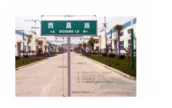 產(chǎn)品工藝:表面處理采用靜電噴塑、汽車烤漆等,牌頭采用型材制作,標(biāo)準(zhǔn)件ABS托盤,路名字采用工程級(jí)反光膜或3M鉆石級(jí)反光膜絲印等。