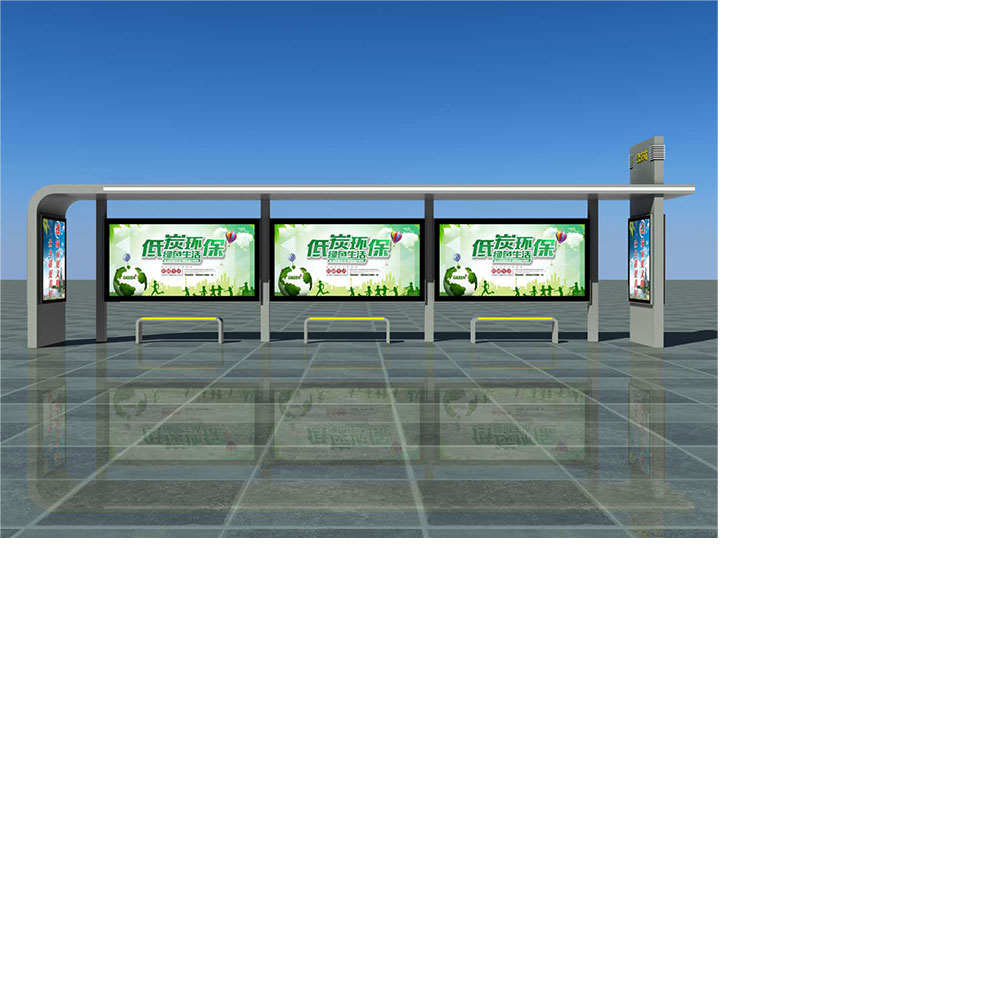 5.公交候車亭設(shè)計材料上考慮其環(huán)境為戶外,采用不銹鋼、鍍鋅板、玻璃等耐用易清潔的材料。造型上保持了較為開放的空間構(gòu)成。此外,公交站臺設(shè)計突出節(jié)能與環(huán)保的特點,使用太陽能儲備電能支持智能公交系統(tǒng),人們可以通過電子屏幕查詢到所稱車次、等候時間,還可以提供電子地圖,方便查詢所去的地方及乘車路線。